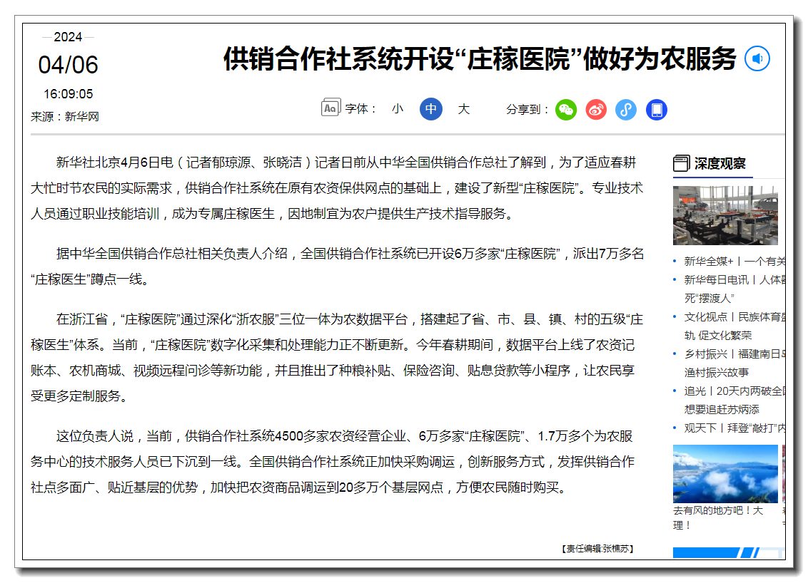 據(jù)中華全國供銷合作總社相關(guān)負責人介紹,全國供銷合作社系統(tǒng)已開設(shè)6萬多家“莊稼醫(yī)院”,派出7萬多名“莊稼醫(yī)生”蹲點一線。