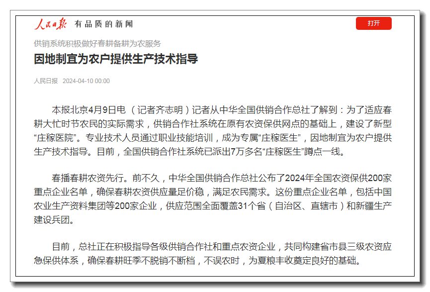 春播春耕農(nóng)資先行。前不久,中華全國供銷合作總社公布了2024年全國農(nóng)資保供200家重點(diǎn)企業(yè)名單,確保春耕農(nóng)資供應(yīng)量足價(jià)穩(wěn),滿足農(nóng)民需求。這份重點(diǎn)企業(yè)名單,包括中國農(nóng)業(yè)生產(chǎn)資料集團(tuán)等200家企業(yè),供應(yīng)范圍全面覆蓋31個(gè)省(自治區(qū)、直轄市)和新疆生產(chǎn)建設(shè)兵團(tuán)。