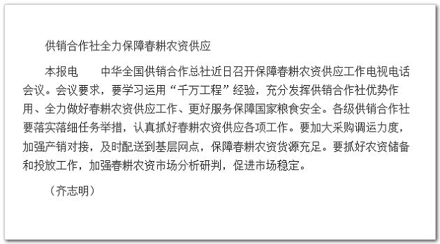 中華全國供銷合作總社近日召開保障春耕農(nóng)資供應(yīng)工作電視電話會議。會議要求,要學(xué)習(xí)運(yùn)用“千萬工程”經(jīng)驗(yàn),充分發(fā)揮供銷合作社優(yōu)勢作用、全力做好春耕農(nóng)資供應(yīng)工作、更好服務(wù)保障國家糧食安全。各級供銷合作社要落實(shí)落細(xì)任務(wù)舉措,認(rèn)真抓好春耕農(nóng)資供應(yīng)各項(xiàng)工作。要加大采購調(diào)運(yùn)力度,加強(qiáng)產(chǎn)銷對接,及時配送到基層網(wǎng)點(diǎn),保障春耕農(nóng)資貨源充足。要抓好農(nóng)資儲備和投放工作,加強(qiáng)春耕農(nóng)資市場分析研判,促進(jìn)市場穩(wěn)定。
