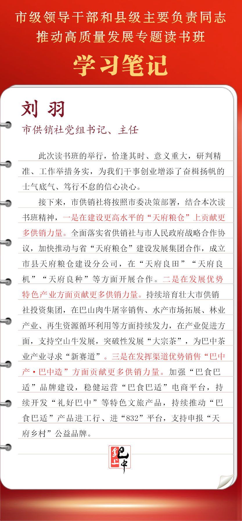 接下來(lái),市供銷社將按照市委決策部署,結(jié)合本次讀書(shū)班精神,全面落實(shí)省供銷社與市人民政府戰(zhàn)略合作協(xié)議,加快推動(dòng)與省“天府糧倉(cāng)”建設(shè)發(fā)展集團(tuán)合作,成立市縣天府糧倉(cāng)建設(shè)分公司,在“天府良田”“天府良機(jī)”“天府良種”等方面開(kāi)展合作。持續(xù)培育壯大市供銷社投資集團(tuán),在巴山肉牛屠宰銷售、水產(chǎn)市場(chǎng)拓展、林業(yè)產(chǎn)業(yè)、再生資源循環(huán)利用等方面持續(xù)發(fā)力,在產(chǎn)業(yè)促進(jìn)方面,支持空山牛發(fā)展,突破性發(fā)展“大宗茶”,為巴中茶業(yè)產(chǎn)業(yè)尋求“新賽道”。加強(qiáng)“巴食巴適”品牌建設(shè),穩(wěn)健運(yùn)營(yíng)“巴食巴適”電商平臺(tái),持續(xù)開(kāi)發(fā)“禮好巴中”等特色文旅產(chǎn)品,持續(xù)推動(dòng)“巴食巴適”產(chǎn)品進(jìn)工行、進(jìn)“832”平臺(tái),支持申報(bào)“天府鄉(xiāng)村”公益品牌。